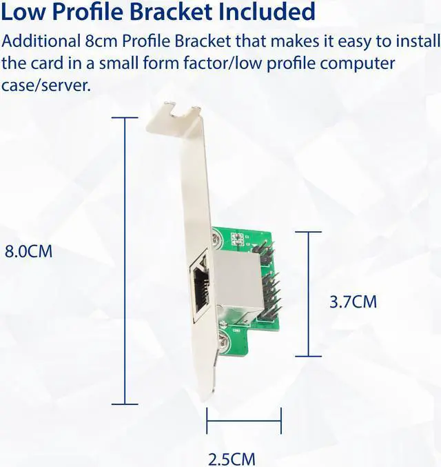 • The high quality PCIe 2.5 Gigabit NIC with 12cm profile bracket and Additional 8cm Profile Bracket that makes it easy to install the card in a small form factor/low profile computer case/server.