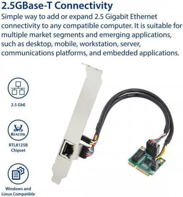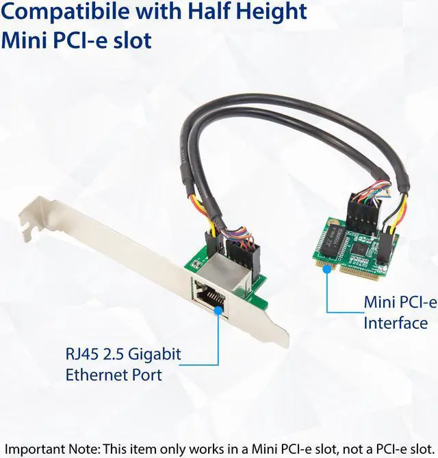 • With this Mini PCIe Card, you can add a 10/100/1000/25000 Mbps Ethernet port to any PC through a Mini PCIe slot.Fits any Mini PCI Express socket; Additional 8cm Low-profile bracket provides the option for installation in small size HTPC case.