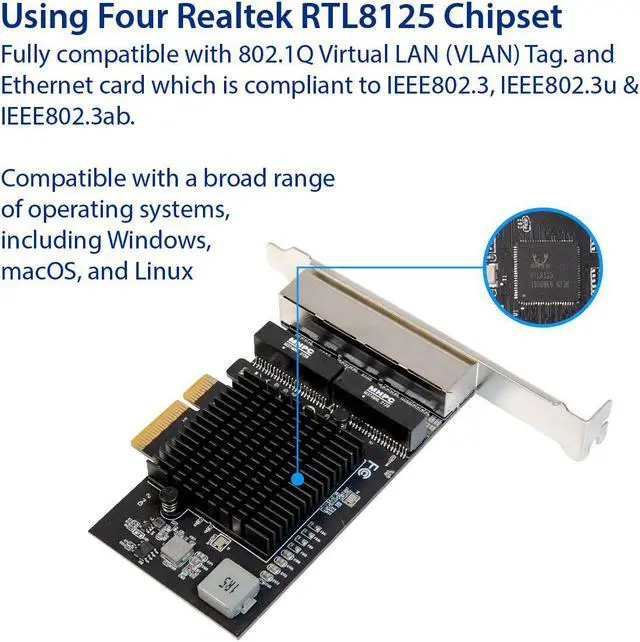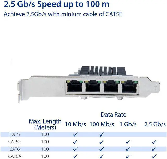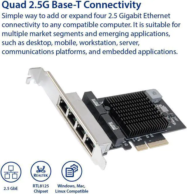Provides Quad 2.5 Gigabit Ethernet Connectivity to Mac Pro Towers and Windows PCs. Simple way to add or expand 2.5 Gigabit Ethernet connectivity to any compatible computer. It is suitable for multiple market segments and emerging applications, such as desktop, mobile, workstation, server, communications platforms, and embedded applications.