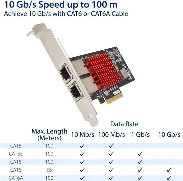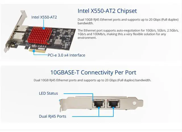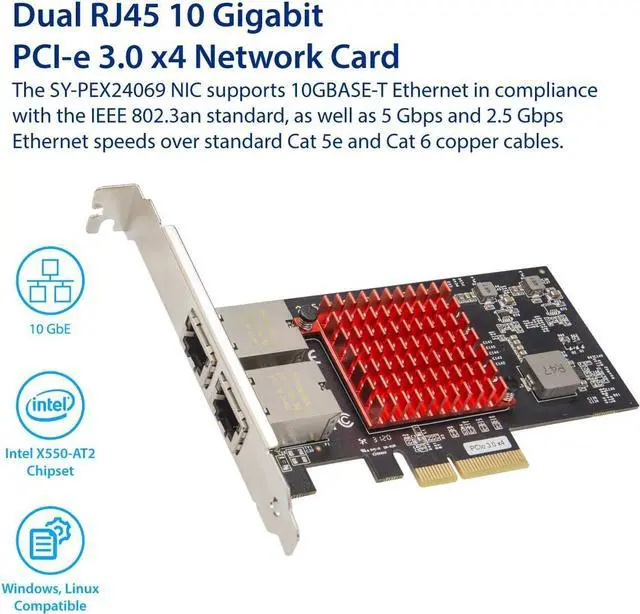 The SY-PEX24069 NIC supports 10GBASE-T Ethernet in compliance with the IEEE 802.3an standard, as well as 5 Gbps and 2.5 Gbps Ethernet speeds over standard Cat 5e and Cat 6 copper cables. Compliant to the IEEE 802.3bz standard ratified in September 2016, the SY-PEX24069 NIC is also backwards-compatible with legacy 1000BASE-T Ethernet. The X550-AT2 is a single-chip, single-port, high-performance PCIe 3.0 Multi-Gig 10GBASE-T/5GBASE-T/2.5GBASE-T/ 1000BASE-T/100BASE-TX Ethernet adapter. It incorporates Ethernet Controller X550-AT2 to deliver 10 GbE, 5 GbE and 2.5 GbE network connectivity speeds over 100 m with zero change required for legacy cabling. Speeds ranging from 5 GbE to 100 M are supported by Cat 5e cabling while 10GbE requires a minimum of Cat6 with Cat 6a running up to 100 m.