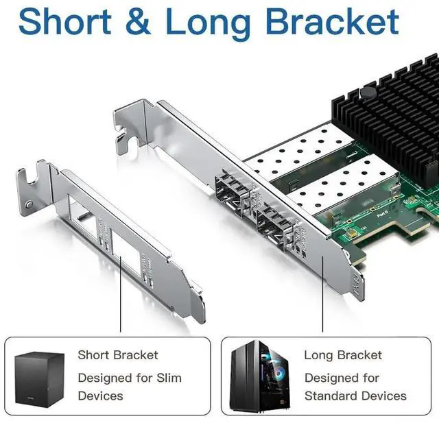 SFP+ PCI-E NIC: 10Gb Dual SFP+ Ports, apply to 10G SFP+ module/ DAC /AOC. PCI Express 3.0. 8.0 G T/s x 8 Lane, compatible with PCIE X8, X16 Slot