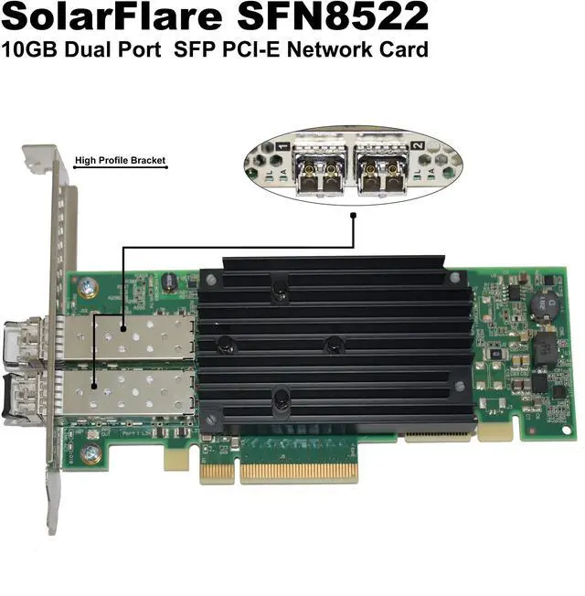 Solar Flare SFN8522 Dual-Port 10Gb/s PCIe 3.1 x8 Ethernet Adapter is a high-performance network interface card (NIC) designed for low-latency, high-throughput applications. With dual 10GbE ports, it delivers ultra-fast data transfer speeds for data centers, cloud computing, virtualization, and high-frequency trading environments. Built on Solar Flares advanced architecture, it supports high-bandwidth workloads, low CPU overhead, and enhanced security features. The PCIe 3.1 x8 interface ensures optimal performance and scalability, making it an excellent choice for enterprise networking and demanding IT infrastructures.