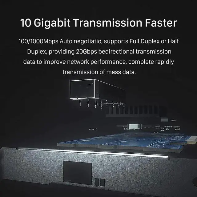 1 GbE/10 Gb, full Duplex / half-duplex auto negotiatio, providing 20G bedirectional transmission data to improve network performance, complete rapidly transmission of mass data.
