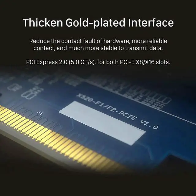 PCI Express 2.0 ( 5.0 GT/s), for PCI-E X8/X16 Slots, including Low Profile and Full Height. Thicken gold-plated interface, more reliable contact, and transmit more stable.