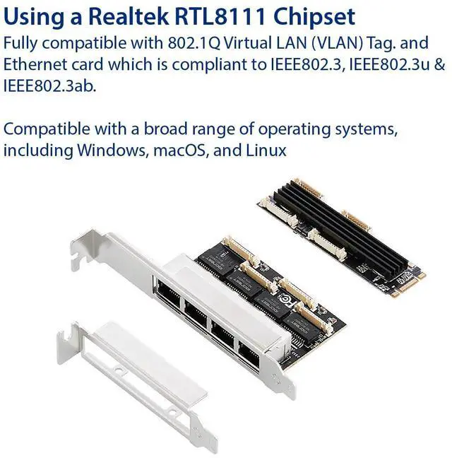 The 4 Port Gigabit M.2 M+B Key Ethernet Module is a high-performance networking solution designed to enhance connectivity and data transfer capabilities in a wide range of computing environments. Leveraging the power of the Realtek RTL8111H chipset, this Ethernet card delivers robust Gigabit Ethernet connectivity, making it ideal for applications where speed, reliability, and versatility are paramount.