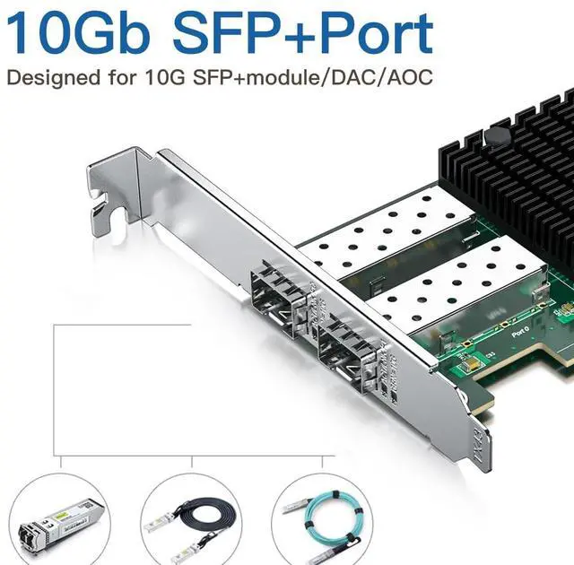 SFP+ PCI-E NIC: 10Gb Dual SFP+ Ports, apply to 10G SFP+ module/ DAC /AOC. PCI Express 3.0. 8.0 G T/s x 8 Lane, compatible with PCIE X8, X16 Slot