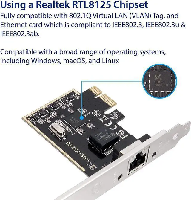This pci-based 10/100/1000/25000 2.5 Gigabit Ethernet network adapter card provides a simple connection to a 2.5 Gigabit Ethernet network, and is fully compatible with 802.1Q virtual LAN (VLAN) tag. And Ethernet card which Is compliant to IEEE802.3, IEEE802.3U & IEEE802.3ab.