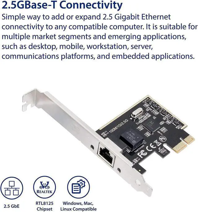 What you get: IO crest 2.5 Gigabit PCI-E network card x1, driver Disk x1, 8cm low-profile bracket x1. Backed by IO crest 3 Year hassle-free warranty and lifetime customer service. Important Note: only work with PCI-E slot, not for PCI slot.