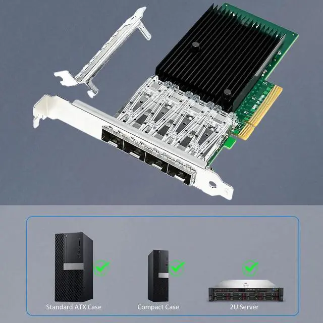 It comes with a pre-installed 12cm regular-profile bracket and an 8cm low-profile bracket.(Not include SFP+ module/DAC cable/AOC cable)
