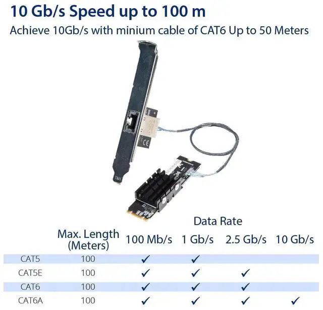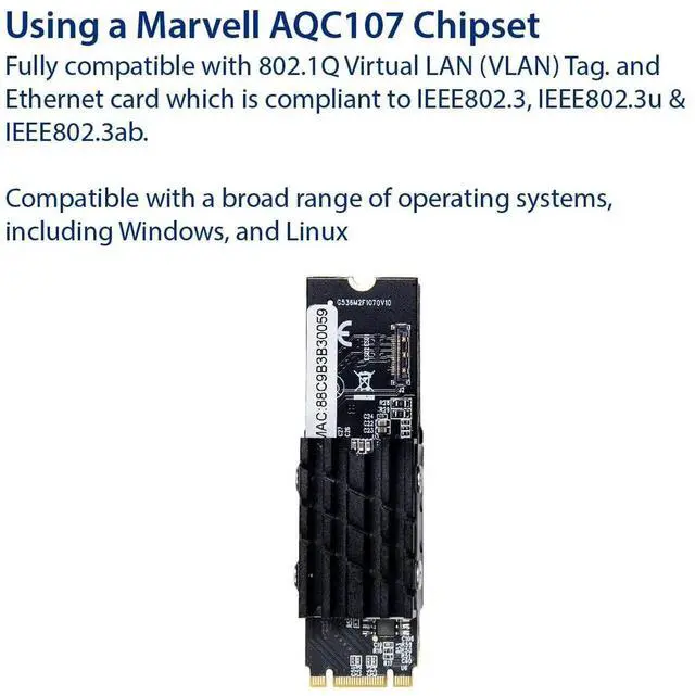 The AQC107 chipset in M.2 format is a high-performance, low power consumption Ethernet controller that is designed for use in next-generation networking applications. This chipset is built with advanced technology that supports the latest Ethernet standards, including 10 GbE, 5 GbE, 2.5 GbE, and 1 GbE. The AQC107 is optimized for use in M.2 form factor devices, making it a great choice for compact, low-power network adapters and other Ethernet-connected products. With its compact size and low power consumption, the AQC107 chipset in M.2 format provides a cost-effective and efficient solution for high-speed Ethernet networking. Additionally, it features a robust design that is built to withstand harsh industrial environments, making it ideal for use in a wide range of applications, including data centers, cloud computing, and enterprise networks.