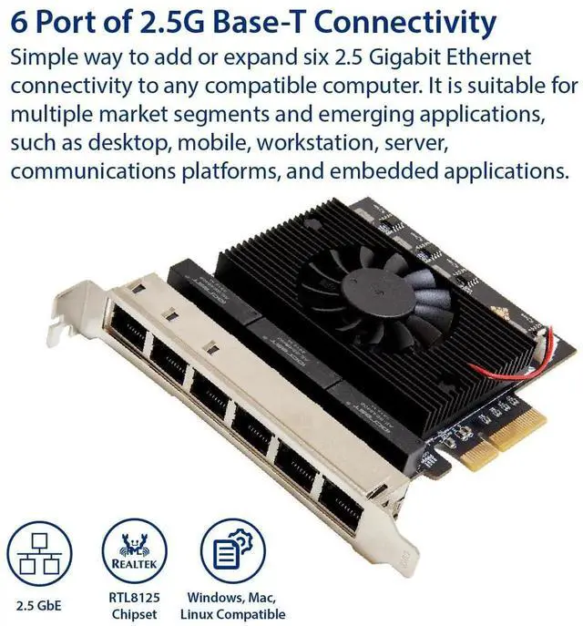 Upgrade your network to the next level with our 6 Port 2.5 Gigabit Network Adapter featuring the Realtek RTL 8125B Chipset. Experience lightning-fast speeds, seamless connectivity, and effortless installation. Whether you're a home user or a business professional, this adapter is your ticket to a smoother, more efficient network experience.