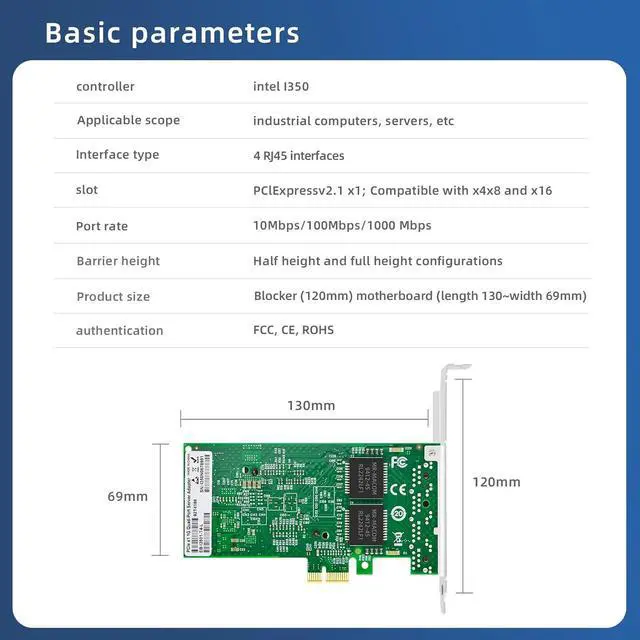 • The I350-T4 network card can connect to industrial cameras, proximity sensors, displacement sensors, lasers, and other sensors with RJ45 transmission interfaces. It supports 10Mbps/100Mbps/1000Mbps rate adaptation, full duplex and half duplex modes, and each network port has a unique MAC address.