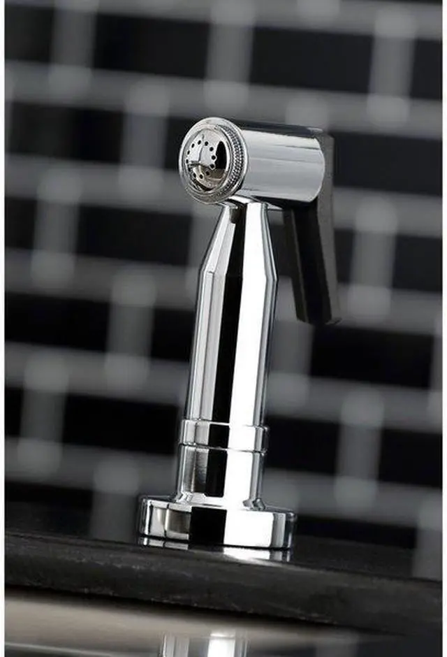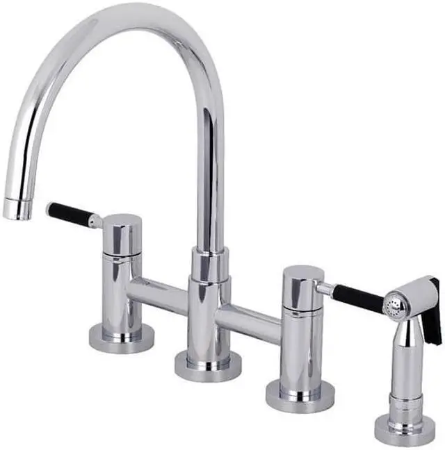 This faucet boasts bold- sleek design with its cylindrical styling. While bridge faucets typically have a traditional appeal- this particular design is a more modern interpretation. Allow the polished chrome finish to pop against your surrounding kitchen decor due to the added architectural elements. The brass construction and swivel abilities provide a sturdy and reliant fixture- great for both dual and single bowl sinks. Utilize the included matching finish side-sprayer for convenience in cleaning hard-to-reach areas.