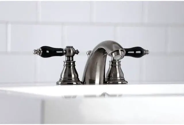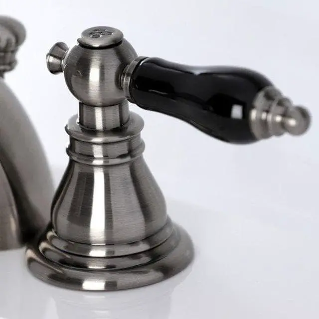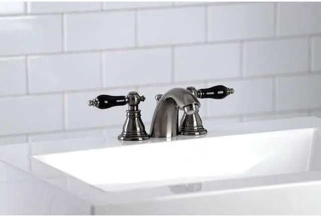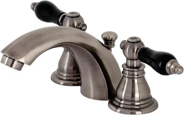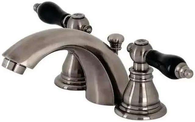 Crafted in commendations to English nobility- the exemplary design of this faucet manifests regality and elegance with its black porcelain handles. Emulating the widespread look- mini-widespread bathroom faucets are for those that love detailed facets and clean lines. These compact faucets provide all of the design elements of a quality faucet without the need for a deck plate in 3-hole sinks. The Duchess mini-widespread bathroom faucet with plastic pop-up and its featured sturdy brass construction and premium black stainless finish glamorize your home's traditional ensemble for years to come. Glamorize your home today with the traditional elegance of this faucet. A matching finish drain is also included.
