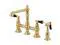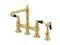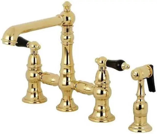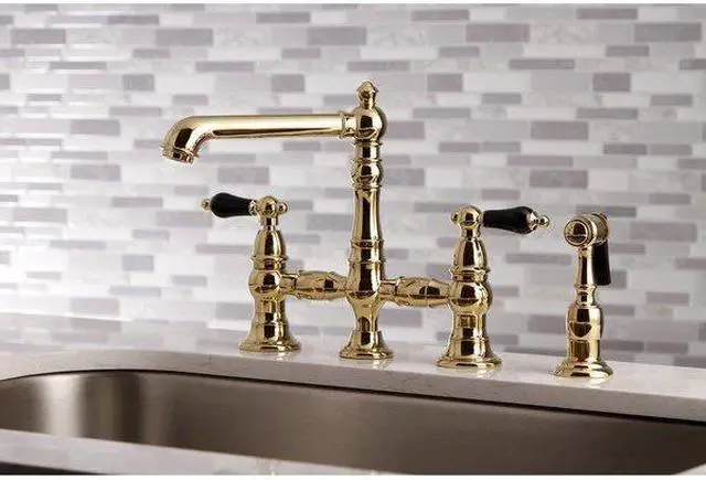 Crafted in commendations to English nobility- the exemplary design of this faucet manifests regality and elegance with its black porcelain handles. Whether you are striving for a Victorian-inspired kitchen or a vibrant 1950s-themed space- the unique bridge design is a highly favored option amongst those doing period-style kitchens. Because of its added architectural elements and detailing- the polished brass finish will pop against your surrounding kitchen decor. Allow the brass construction- side sprayer- and swivel abilities to provide a sturdy and reliant fixture- great for use with any sink.