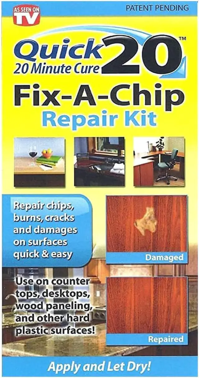 Fix chips and burns on surfaces with three simple steps! No Heat Fix-A-Chip Repair Kit is a fast, safe, easy three-step solution for fixing dings and damage on almost any hard household surface - wood, plastic, or stone in just 20 minutes. Works on areas with and without texture: furniture, counters, paneling. Match any color with included retouch paint. Replicates the look and feel prior to damage. 4 oz. (Packaging may vary)