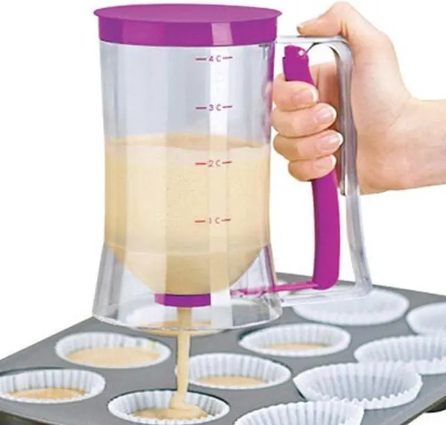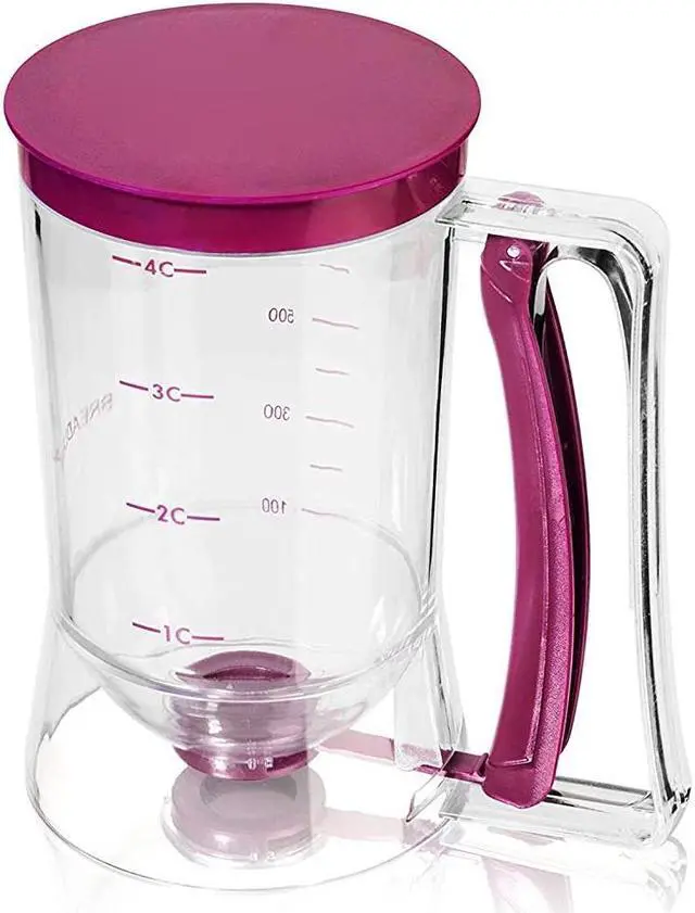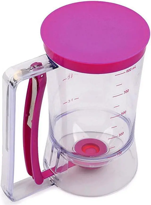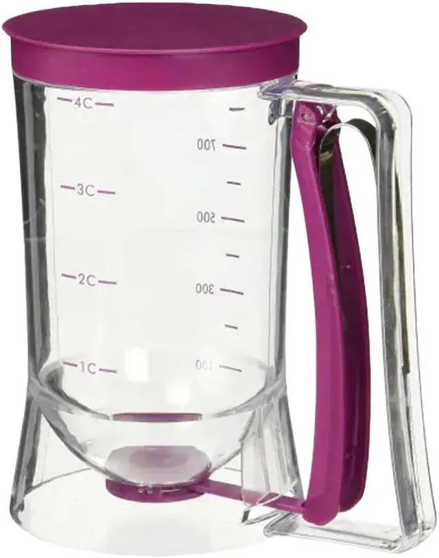 Kole Pancake Batter Dispenser with Squeeze Handle, your go-to tool for perfectly sized cupcakes, muffins, and pancakes! This innovative dispenser features a squeeze handle that releases batter from the bottom, ensuring consistent portions without messy drips. With precise measurements on the sides, you can easily dispense just the right amount for your baking needs. Cleanup is a breezesimply add soap and water, shake, rinse, and wipe down. Perfect for marinades, sauces, and syrups too, this BPA-free, dishwasher-safe dispenser holds 900ml and measures approximately 6.5" tall by 4" in diameter.