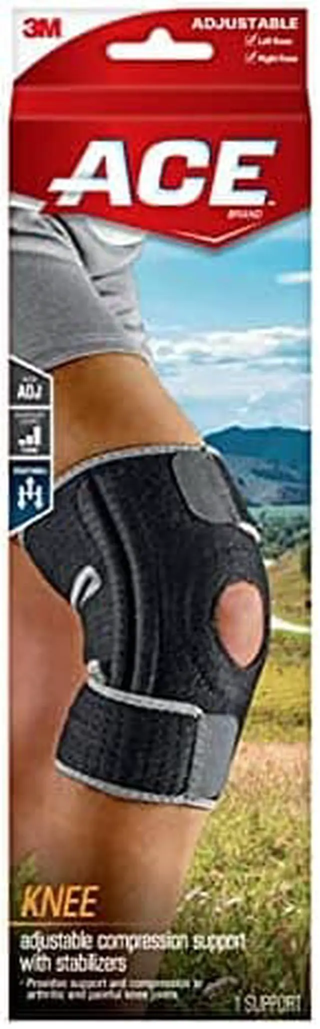 Improved size range. Fits 16 22 Provides stabilizing compression to weak, sore muscles and joints Dual side stabilizers for lateral support Comfort-sleeve holds brace in place, making it easier to put on and Adjust Soft, neoprene-blend material is breathable to help keep you cooler and drier Designed to fit the contours of your knee Adjustable straps for customizable support Flexible design allows a full range of motion Easy-to-use, convenient design can be worn on either knee Soft binding for exceptional comfort
