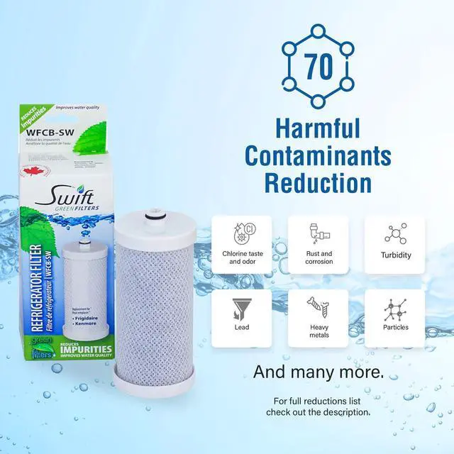 "Swift Green Filters SGF-WFCB Compatible for WFCB,WF1CB, 240394501, NGRG-2000, RF-100, RG-100, 218710901, 218710902 Refrigerator water Filter most compatible best in class and technology Internationally Certified .Swift Green Filters will deliver fresh, clean, and great tasting water and ice cubes. Designed with technology using recycled coconut shells that create an internal carbon filter with up to 50% more filtering pores. The result is safe and clean drinking water that has eliminated contaminants and impurities that may have been present.