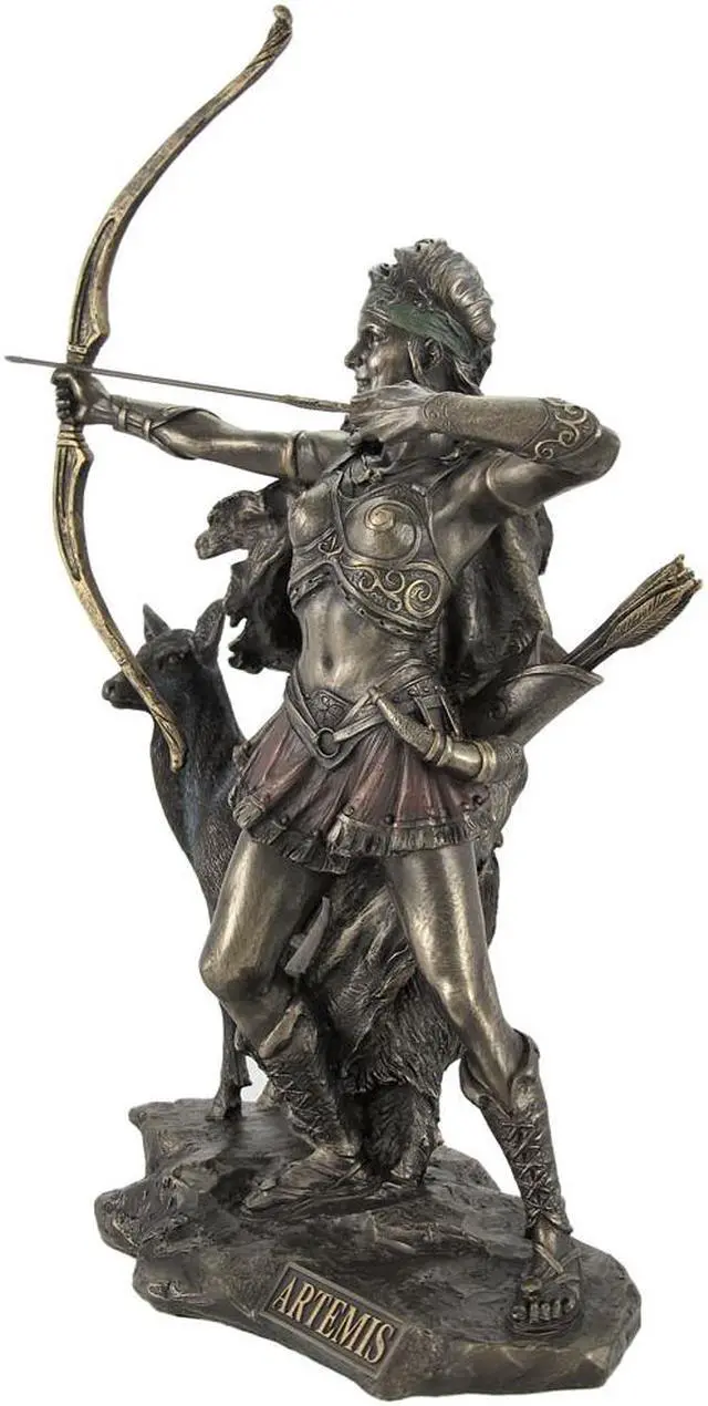 Artemis was the Hellenic goddess of the hunt, wild animals, wilderness, childbirth, virginity and protector of young girls, bringing and relieving disease in women; she often was depicted as a huntress carrying a bow and arrows and the deer and the cypress were sacred to her. This statue depicts Artemis with bow and arrow in hand, her wild hair and cloak flowing around her, with her doe companion by her side. Made of cold cast resin, it measures 11 3/4 inches tall, 7 1/2 inches long, 4 inches wide, and the beautiful bronze finish is accented by subtle hints of color.