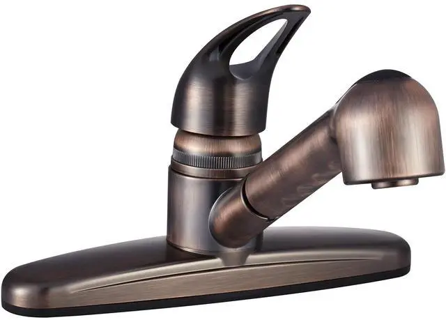 • This faucets sleek and classy design features a convenient pull-out sprayer with dual settings, which easily toggle between both stream and spray functions with the finger-friendly top button. This model has a single-lever for easy operation to quickly adjust the temperature and water flow, and comes with a ceramic disc valve, so there will be no splashing with the aerated stream. Dura Faucet ensures that whatever youre cleaning youll be doing so comfortably!