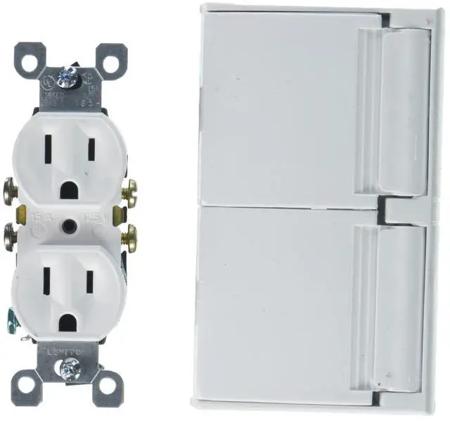 This weatherproof standard cover includes a duplex receptacle with gasket and flanged horizontal box plus two self-closing flip lids.