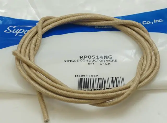Brand new Supco 5 Foot Single Conductor Wire, 14GA, 450C, Hi-Temp, RP0514NG. The durable 14 gauge nickel plated copper wire is rated to 842°F/450°C. Mica high temperature insulation. Max Amps: 45A, Max Wattage: 10KW/5KW, 300 volts.