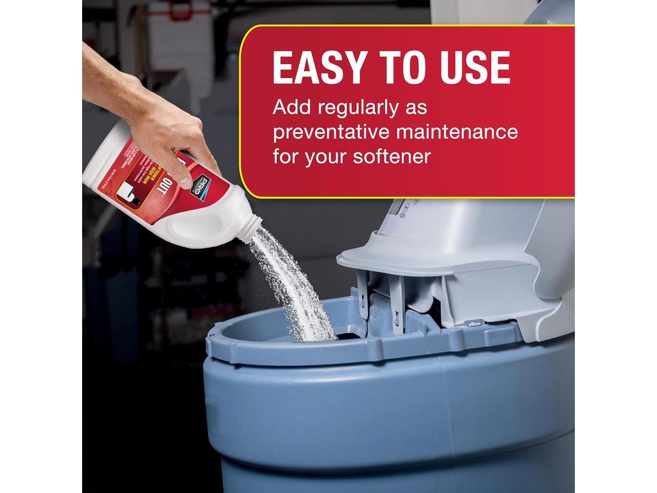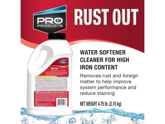 - mproved Lifespan: Rust Out water softener system cleaner removes iron and rust buildup that coats the resin bed and fouls the water softener; Changes rust and iron into a clear solution that easily rinses away without harsh or abrasive chemicals