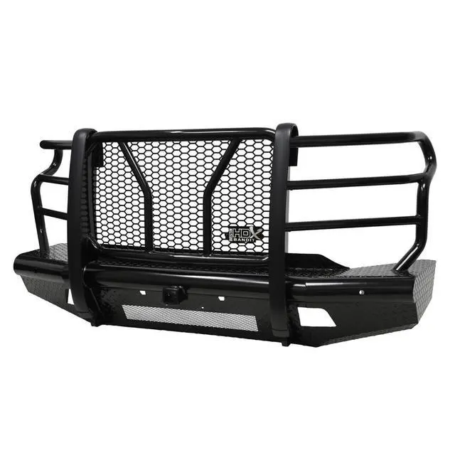 HDX Bandit Front Bumper includes a built-in 2" receiver hitch and two heavy-duty 9, 500 lbs bow shackle mounts, capable of delivering multiple towing options. Compatible for factory fog lamps or LED post mount lights. In addition, some late model Ram and Chevrolet applications feature provisions for factory parking sensors. Bolt-on installation with hardware and mounting brackets included. Available in black powder coat finish.