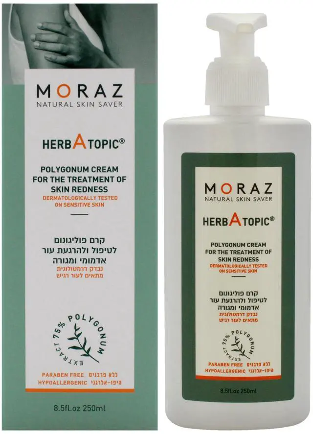 MORAZ HERB A TOPIC SKIN RASH CREAM instantly soothes skin rashes and irritations. This cream made from high quality natural ingredients was developed for severe skin conditions as it hydrates and calms the skin. CONTAINS 75% POLYGONUM EXTRACT. This extract has powerful anti-inflammatory capabilities and is unique to the Galilee region which has natural antioxidant properties. Polygonum is known to heal damaged skin including small wounds, blisters and dryness. FAST ABSORBING atopic cream that is hypoallergenic and fragrance free. Paraben free. HELPS TO REHABILITATE damaged skin, reducing redness and improve flaky skin.