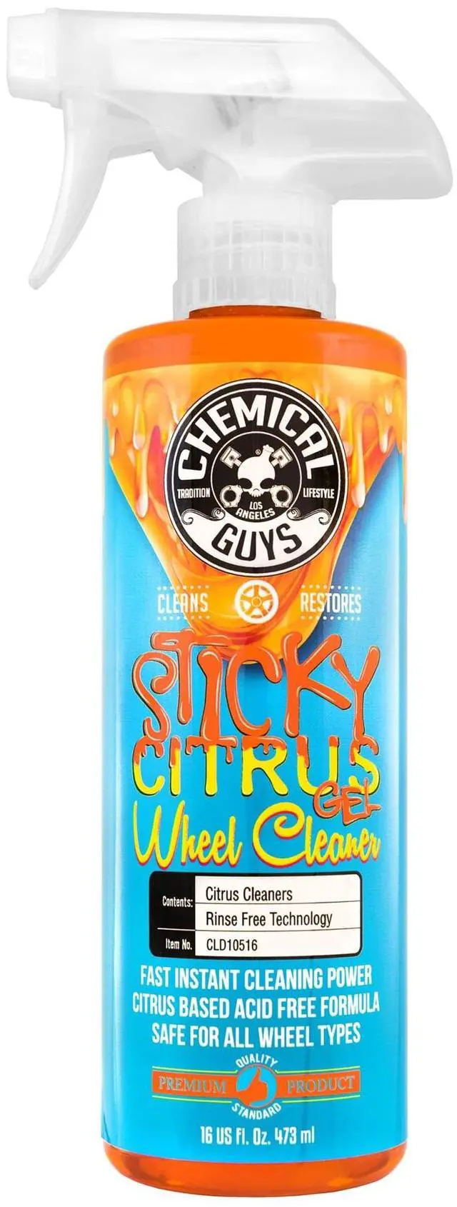 Chemical Guys Sticky Citrus Wheel Cleaner Gel is a powerful, all-natural, and versatile wheel cleaner. Sticky Citrus Gel clings to wheels and rims, lifts and separates brake dust, road grime, dirt, and filth, then rinses easily for a perfectly clean wheel. Use Sticky Citrus Wheel Cleaner Gel on painted, polished, powder coated, chromed, wrapped, aluminum, steel, or carbon fiber wheels, rims, tires, suspension parts, and brake components. Sticky Citrus Wheel Cleaner Gel sticks hard to keep the cleaning power where you need it.