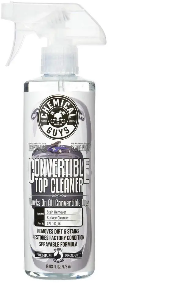 Chemical Guys Convertible Top Cleaner removes dirt and stains from any convertible soft top. The advanced cleaning formula is safe on fabric, vinyl, and synthetic convertible soft tops. Convertible Top Cleaner penetrates deep into fabric to remove stains and restore the soft top material. Use Convertible Top Cleaner to remove embedded contaminants like dirt, dust, road tar, tree sap, mud, bugs, and bird droppings from virtually any convertible soft top. Convertible Top Cleaner gently lifts dirt and stains away from the surface to restore the original look back to your vehicle's soft top.