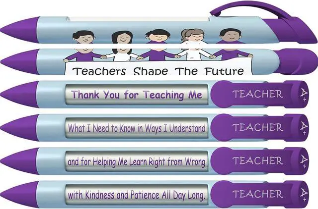 Set includes 6 pens; each pen is a "Teachers Shape the Future" #1 Teacher pen with 4 messages of appreciation that rotate with every click of the pen: Message