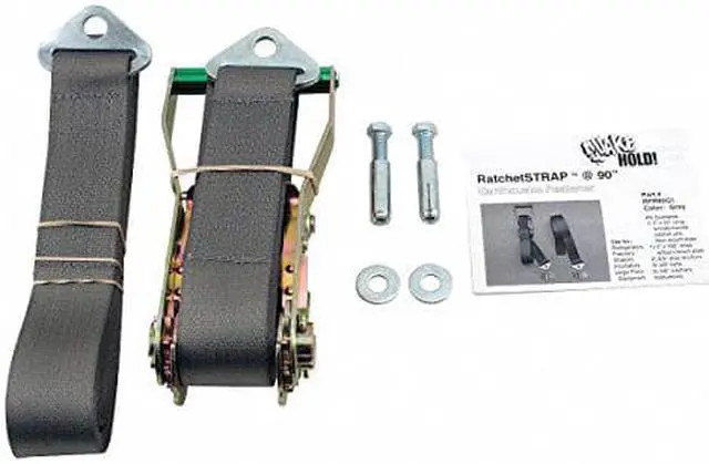 Ratchet Strap, Gray, Weight Capacity 4000 lb., Used For Secure To Concrete Floor And Over -80, -20 Freezers, Multi-Door Deli Refrigerators, Incubators, Shakers, And Other Large Equipment., Includes (1) 2 In. X 90 In. Strap With Wide-Handle Ratchet And Floor-Mount Plate, (1) 2 In. X 180 In. Strap With Floor-Mount Plate, (2) 3/8 In. Drop Anchors, (2) 3/8 In. Anchor Bolts, (2) 3/8 In. Washers, Instructions