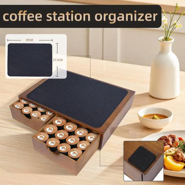 Wooden Coffee Pod Holder Drawer With Silicone Non-Slip Pad,K Cup Organizer Storage Box,Kcup Drawer and Tea Organizer Under Brewer,30 Pod Capacity,Countertop Coffee Station Organizer for Machine Stand