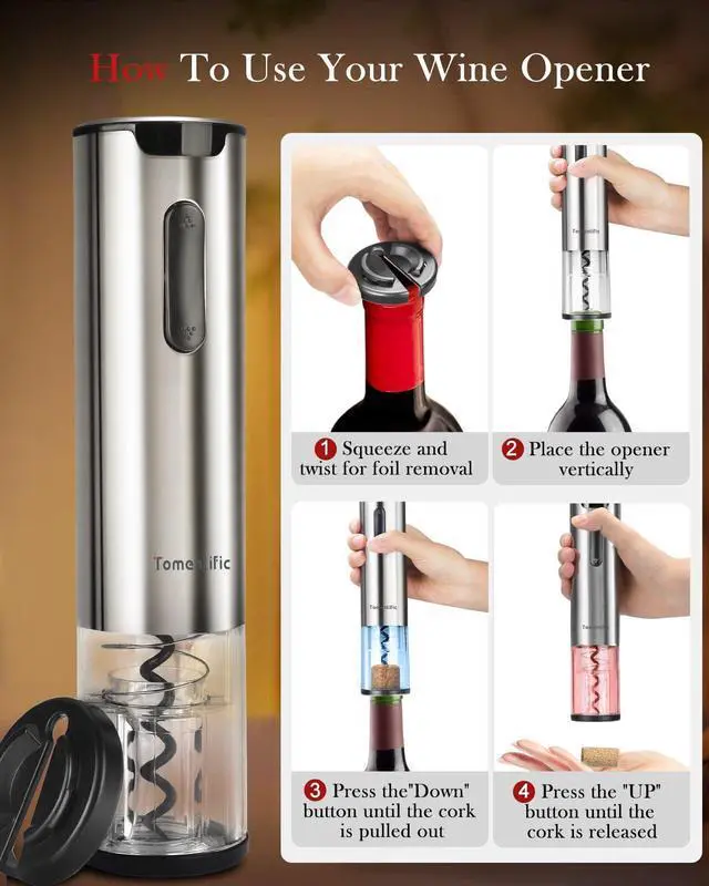 - Simply place on top of your wine bottle, press a button, and your wine will open and ready to serve.
