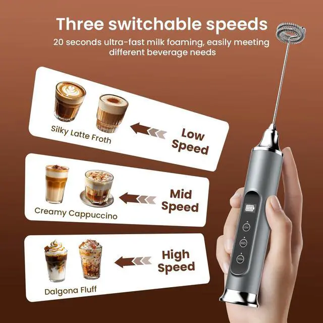 Meet the YUSWKO Milk Frother Wand your all-in-one solution for barista-style beverages and effortless cooking. Featuring intelligent 3-speed adjustment, it effortlessly stir milk without splashing, blends protein powder smoothly, or whips up dense cold foam in just 10 seconds.