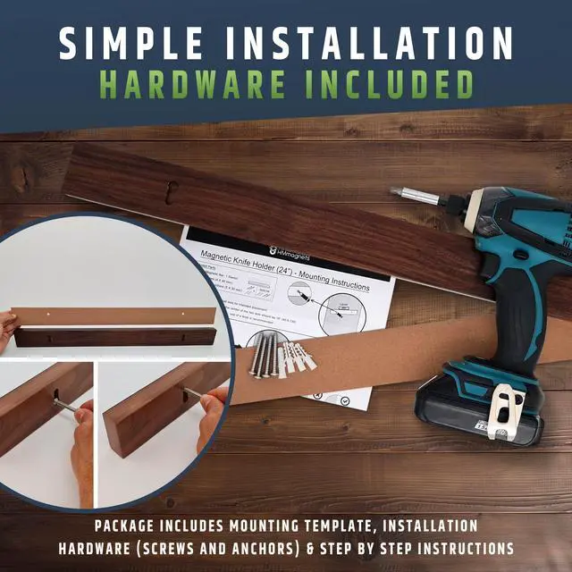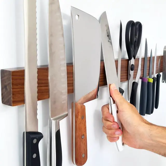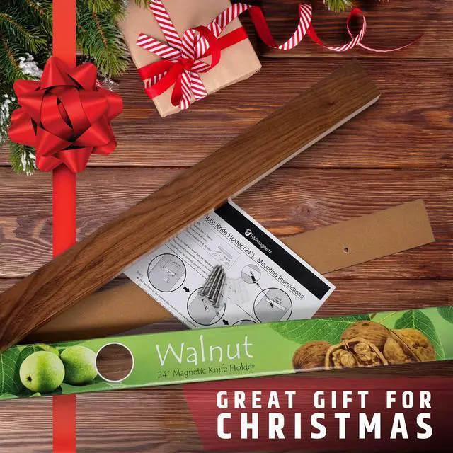 POWERFUL NEODYMIUM MAGNETS: Our upgraded 24" walnut wood knife bar features heavy-duty magnets that never lose their strength. The even magnetic force across the bar securely holds knives while allowing easy release with a gentle tug. The magnets are hidden inside the wood so they will never rust.