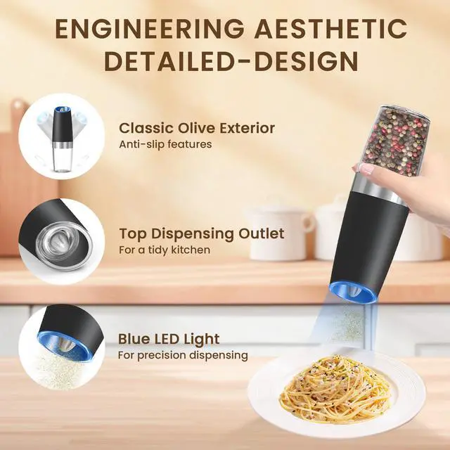 Gravity Electric Salt And Pepper Grinder Set, Automatic Salt And Pepper Grinder Set, Battery Powered (6 AAA Batteries Each), Adjustable Roughness, LED Light, 2 Pack, (Black)