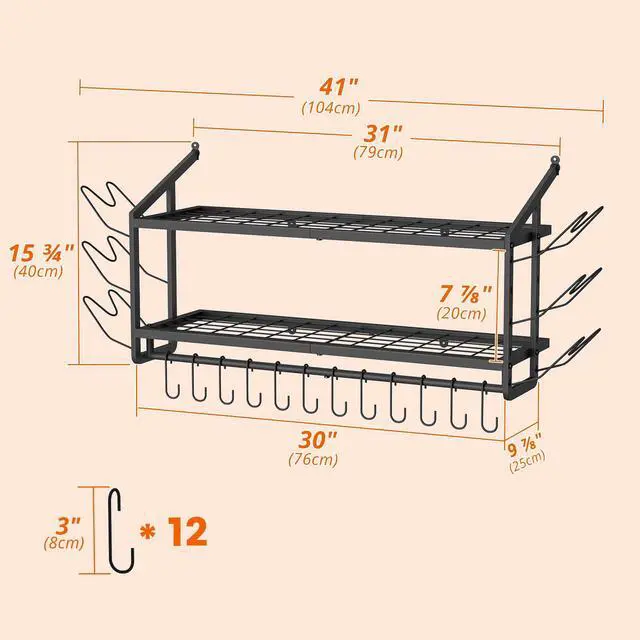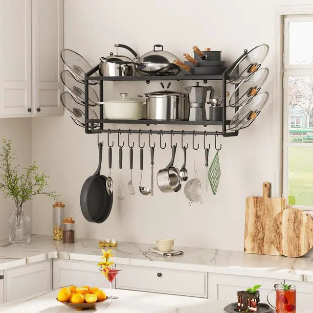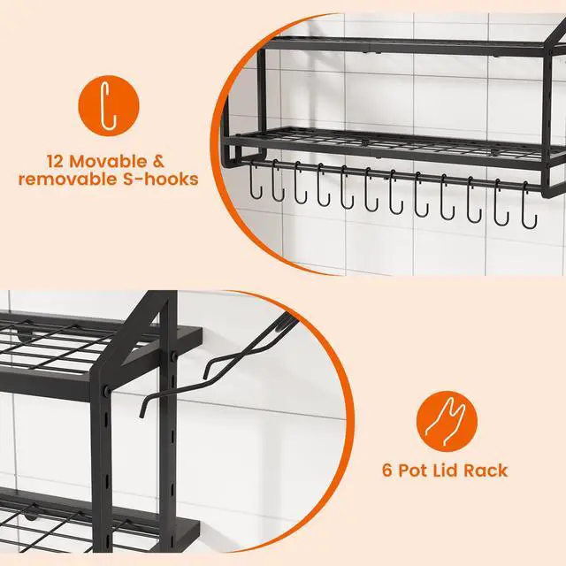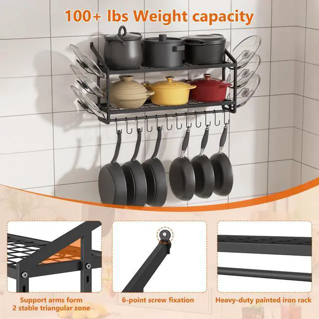 Enhance Your Daily Kitchen Experience VOPEAK pot rack utilizes your kitchen wall space, freeing up cramped countertops or cabinets to keep cookware organized and easily accessibleno more bending over to dig through stacked pots. Securely Hold Your Heavy Cookware Made with thickened, heavy-duty iron, featuring 2 support arms and 6 mounting points for a rock-solid wall attachment. With 200lb weight capacity, it easily holds cast iron pots, Dutch ovens, and other heavy cookwarefar sturdier than extendable racks, with no wobbling or sagging. 12 Removable S-Hooks + 6 Pot Lid Holders Flexible organization with 12 detachable S-hooks for hanging pans and 6 lid racks, allowing you to store 12 pots and 6 lids neatly for easy access. Matte Black Modern Style The heavy-duty rack features a matte black finish that resists grease stains, prevents rust, and blends seamlessly with modern/industrial kitchens for a premium look. 10-Minute Easy Installation Includes clear step-by-step instructions, video guide, wrench, expansion bolts, and screwsinstallation takes just 10-20 minutes. Supports both upward and downward arm orientation.
