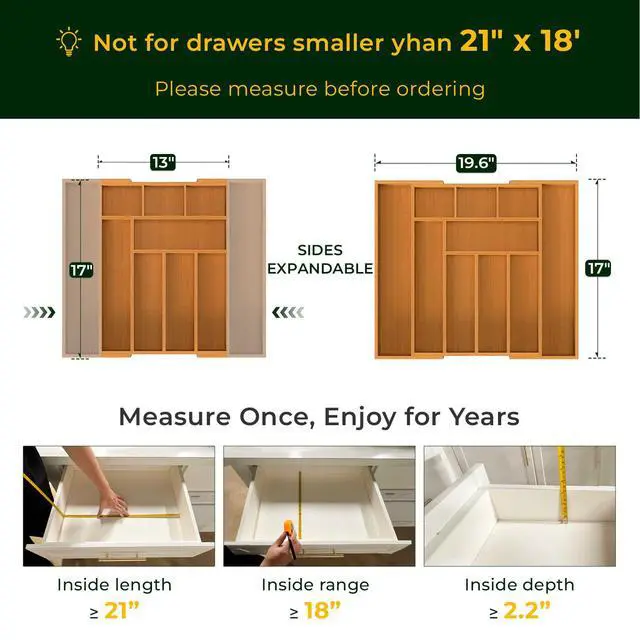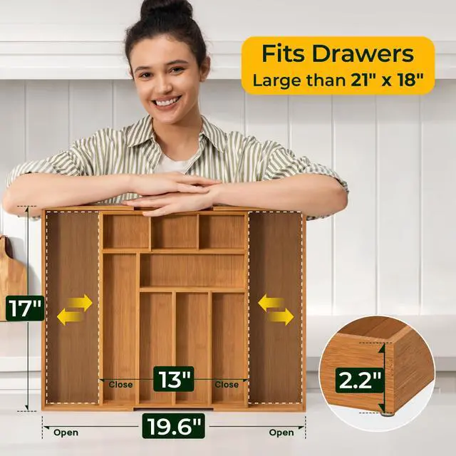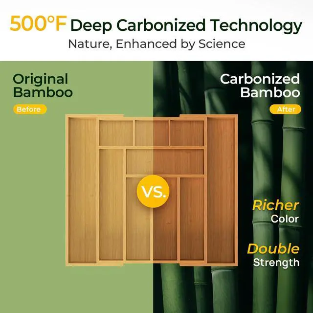 Carbonized Bamboo Kitchen Drawer Organizer,Expandable Silverware Organizer, Utensil Holder & Cutlery Tray, 2.2" Deep for Extra Capacity, Non-Slip Feet Included.
