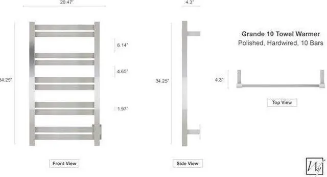 Sometimes huge performance comes in small packages, which is perfectly embodied by the Grande 10 towel warmer from WarmlyYours. The compact profile of this model means it can be installed in a wide variety of locations, while its heat output of 460 BTUs per hour stands toe-to-toe with nearly any electric towel warmer on the market. The broad bars of the Grande 10 offer extra surface area for expedient heating and the design incorporates a spacing that allows the top pair of bars to perfectly accommodate hand towels. With its highly polished finish and 304 stainless steel construction, the Grande 10 is as elegant as it is durable.