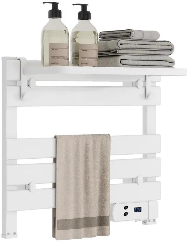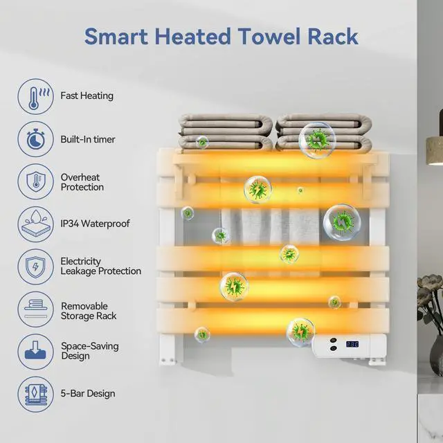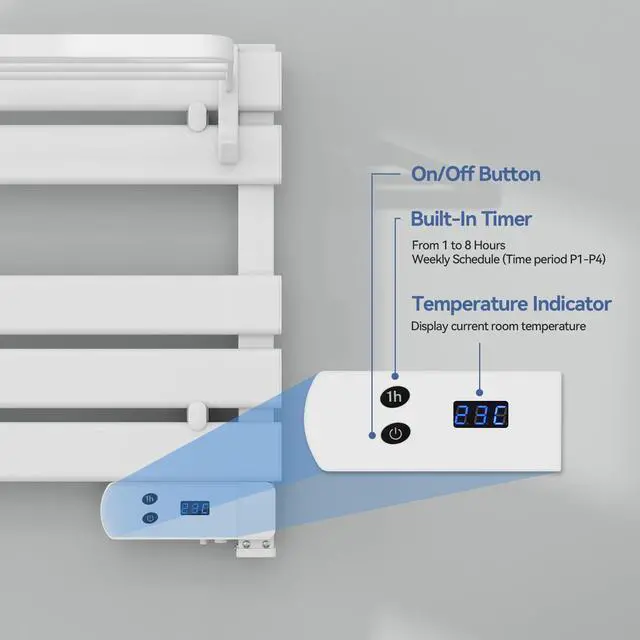 Smart Control Panel: The electric towel warmer features an intuitive and easy-to-use smart panel with a built-in 8-hour adjustable timer. The LED display shows real-time room temperature data, making it simple for users of all ages to operate.