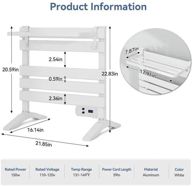 Fast Heating & Safety Protection: With a 150W heating system, the towel heater 15min warms up to 131. The built-in thermostat maintains stable heat, and the overheat protection function automatically halts heating if temperatures exceed safety limits, ensuring safe use for the family.