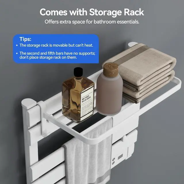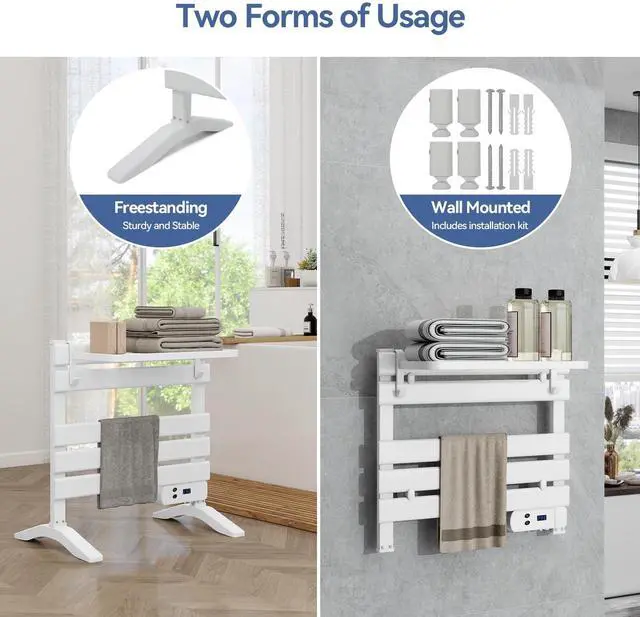Freestanding or Wall-Mounted: Measuring 21.85*20.53*2.36in, the towel warmer rack supports both freestanding (no drilling, easy to move) and wall-mounted installation (space-saving and easy to install). Comes with a removable storage rack for extra space to organize bathroom essentials. The sleek white design with white support legs matches various bathroom styles perfectly.