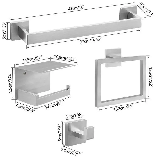 Transform your bathroom with our 5-Piece Bathroom Hardware Set! Each product is crafted to enhance your bathroom experience, offering practical storage solutions while maintaining a stylish look. It includes a 16in towel bar, towel ring, toilet paper holder with shelf, and 2 towel hooks, catering to all your daily bathroom storage needs.