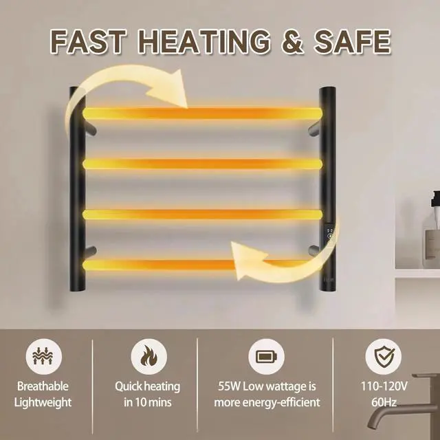 Convenience and Safety It is easy to operate; The towel dryer for bathrooms has touch buttons embedded; and with 2 working time settings: press the control button, setting 2 or 4 hours running time, after the setting time running out, it shut-off automaticly, The working temperature is 131(Fahrenheit). And the towel warmer rack is designed with IPX4 Water Proof Grade.