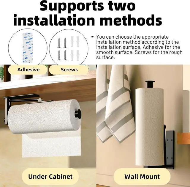 Versatile Installation: Whether you prefer to mount it under the cabinet or stick it to the wall, this kitchen paper towel holder offers flexible installation options. Its adhesive backing ensures a strong and secure attachment, saving you valuable counter space.