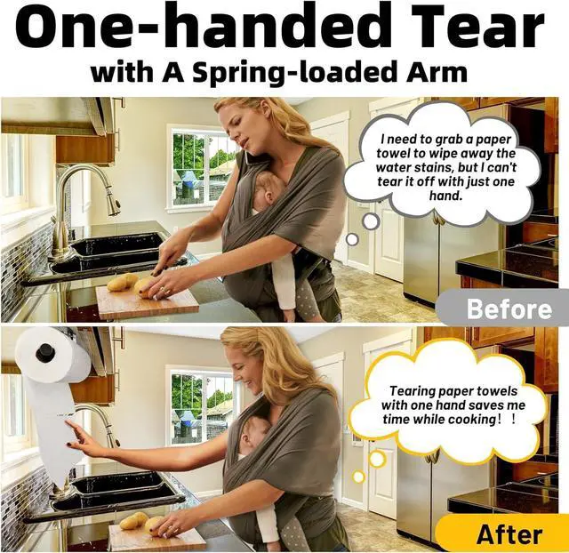 One-Hand Tear: Say goodbye to the hassle of using both hands to tear off a paper towel. Our paper towel holder is specifically designed for one-hand tearing, allowing you to effortlessly grab a sheet with just a quick motion.