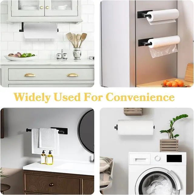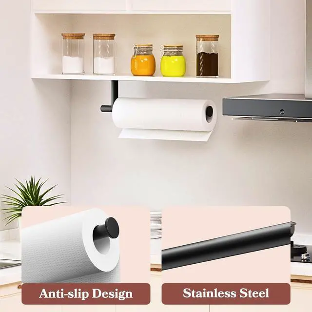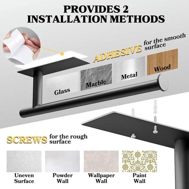 DUAL INSTALLATION METHODOur under cabinet paper towel holder makes installation quick and easy with 2 mounting options: self-adhesive or drilled. You can freely choose the appropriate installation method according to your wall or cabinet situation